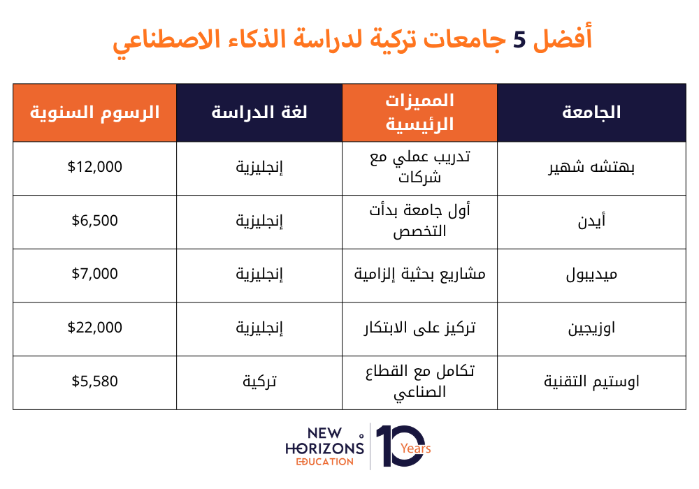 لذلك أعد فريق نيو هورايزونز مرجع يتضمن أفضل جامعات الذكاء الاصطناعي في تركيا 2026، يساعد الطالب على اختيار أفضل جامعة تناسب أهدافه وميزانيته بكل ثقة.