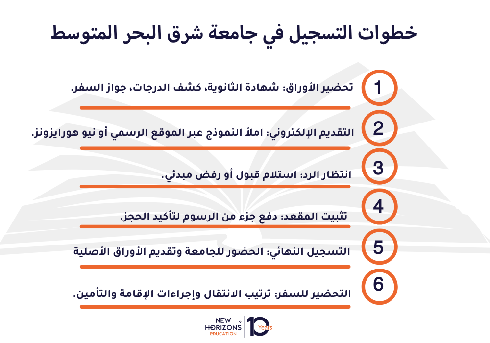 بما أن فريق نيو هورايزونز الوكيل الرسمي لجامعة شرق البحر المتوسط، فهو أحد أفضل مكاتب التسجيل لهذه الجامعة، إذ يضمن لك الحصول على أفضل الخدمات التي تحتاجها، وعملية تسجيل سلسة وخالية من الأخطاء.