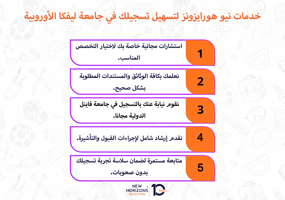 بما أن نيو هورايزونز يحظى بالوكالة الرسمية لجامعة ليفكا الأوروبية، وحاصل على شهادة ISO في جودة الخدمات التعليمية التي يقدمها، فلا شك بأنه أحد أفضل وكلاء جامعات قبرص.