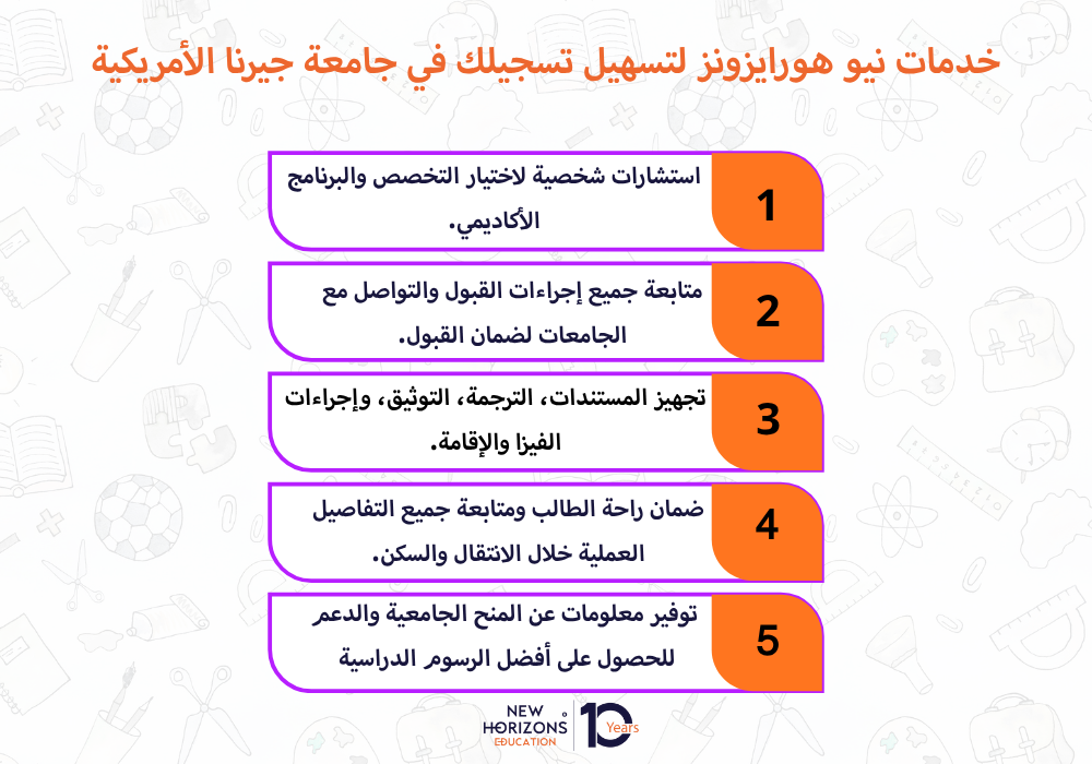 حصل فريق نيو هورايزونز على الوكالة الرسمية من جامعة جيرن الأمريكية، ما يجعله أحد وكلائها الموثوقين لتسجيل الطلاب العرب والأجانب، وتقديم كامل الدعم والخدمات الأكاديمية مجانا.
