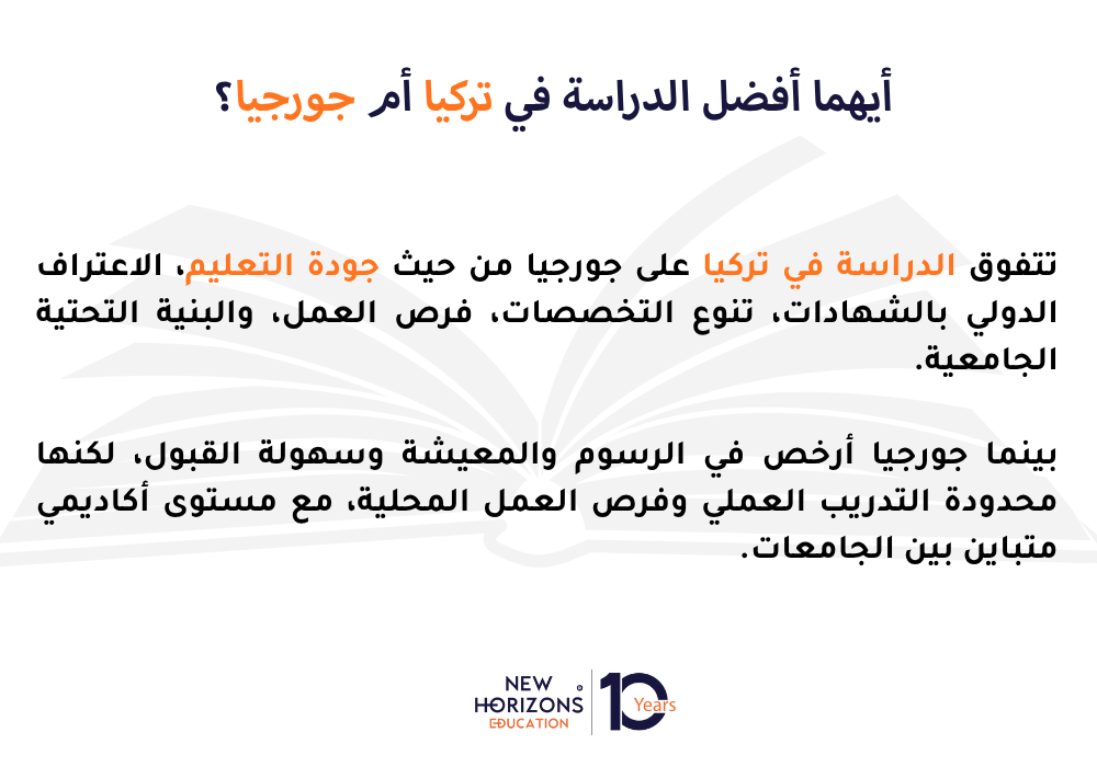 تركيا تتفوق بشكل واضح على جورجيا في التعليم الجامعي والتدريب العملي وفرص العمل بعد التخرج، بينما جورجيا أقل تكلفة لكنها محدودة الجودة.