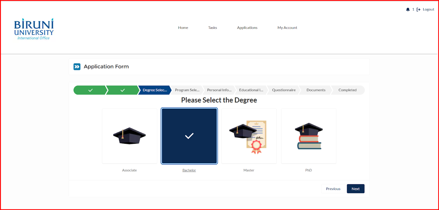 После регистрации вы перейдёте на страницу онлайн-анкеты (заявки), где нужно выбрать степень обучения, на которую вы хотите поступить — бакалавриат, магистратура или докторантура, как показано на примере ниже.