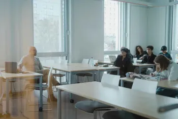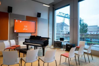 الفصول الدراسية في جامعة SRH عبارة عن غرف نموذجية وليس مدرجات ضخمة، مجهزة بشاشات ذكية